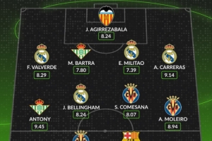 西甲本周最佳阵容公布:安东尼以9.45高分领衔,皇马4将入选