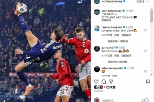 麦克托米奈社媒庆祝球队进入世界杯,配文:“美国宝贝,苏格兰来了!”